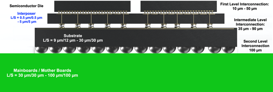 Organic substrates are widely used as carriers for semiconductor integrated circuits such as microprocessors, graphics processors, field-programmable gate arrays (FPGAs), and memories. Semiconductor package substrates can be divided into general purpose semiconductor package substrates, tape-automated bonding (TAB) carriers, and chip-on-film (COF) carriers (see Figure 1). Organic substrates are made by printed wiring board-based technologies used for semiconductor device packaging, and are separate from the choice of semiconductor package or semiconductor device type. It is also classified into interposer and substrate according to role played in a given semiconductor package (see Figure 2).