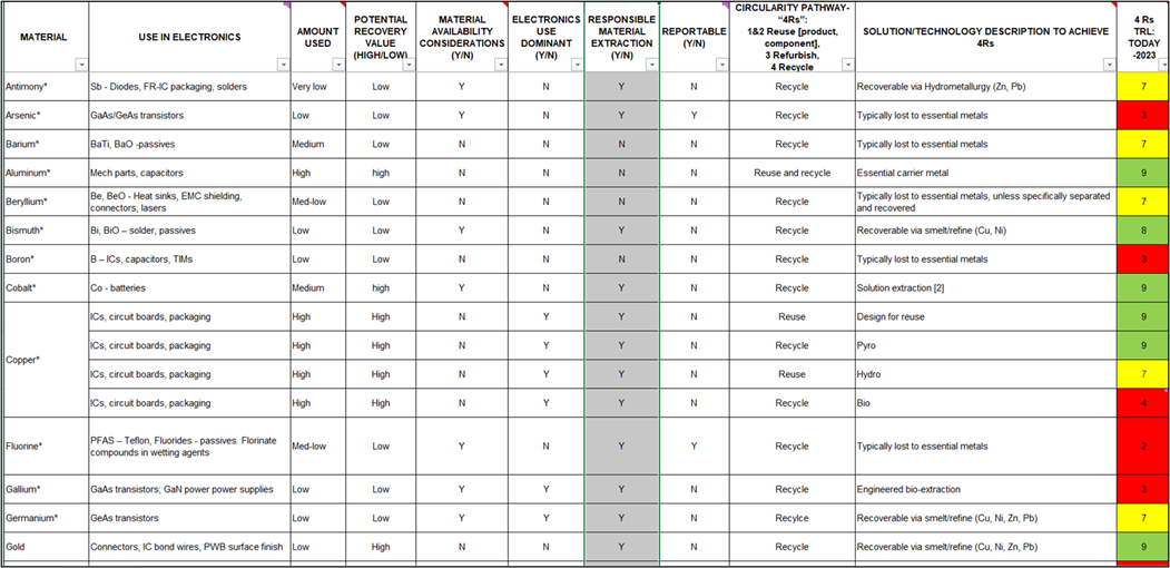 Table 3 Elemental materials used in electronics, their sustainability issues, and technology readiness of the appropriate recycling and reuse technologies.