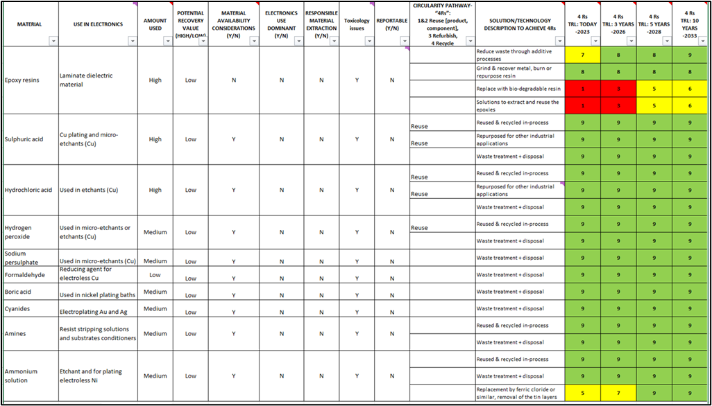 Table 4. Compound materials used in PCBs and their manufacture, the associated sustainability issues, and technology readiness of the appropriate recycling and reuse technologies.